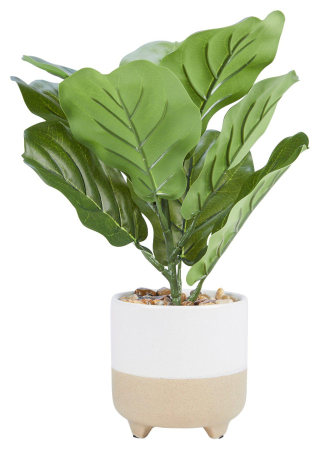 Bring a touch of nature indoors with this stunning 13.5 in Faux Fiddle Leaf Plant, elegantly set in a stoneware pot. The lifelike leaves add a fresh feel to any room, without the need for any maintenance. Perfect for brightening up your living space, office, or any corner that needs a bit of greenery, this faux plant offers a timeless and versatile decor option. Measures approximately 13.5 in x 10 in.