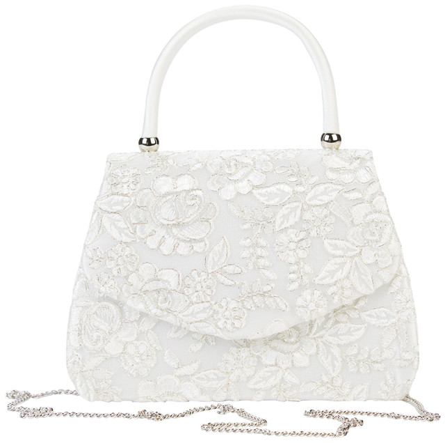 This elegant clutch showcases a lace design wrapped all around for a timeless look. It includes a slip pocket inside, a single handle for handheld style, and a chain strap for hands-free convenience.