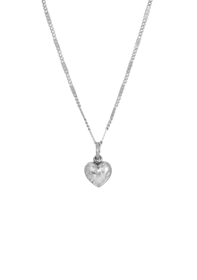 This necklace features a delicate chain paired with a petite puffed heart pendant, beautifully etched with floral patterns for a subtle elegant touch. Its minimalist design makes it a versatile piece that effortlessly complements casual and formal outfits alike. Whether worn alone or layered, this charming necklace adds a soft, feminine accent to any look. Length 15 in., width 7 mm.