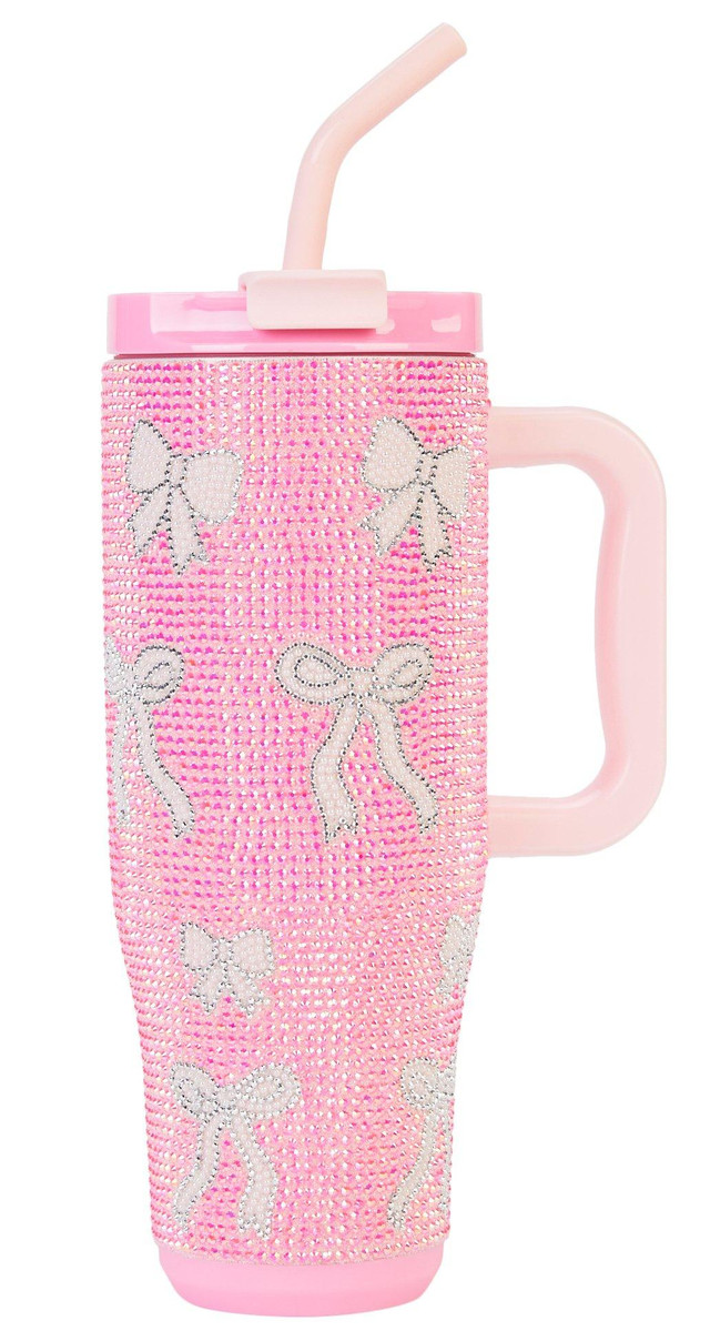 This 40 oz tumbler features a stainless steel interior and is decorated with pink rhinestones and white bows all over. It includes a lid and reusable straw, combining style and convenience for everyday hydration.