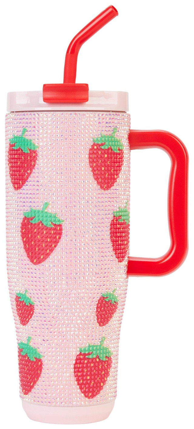 This 40 oz tumbler features a stainless steel interior and a vibrant strawberry design with rhinestones all over. It includes a lid and reusable straw, making it perfect for stylish and convenient hydration on the go.
