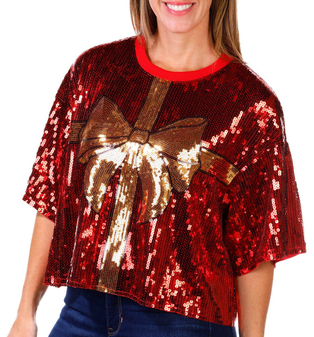 Celebrate the season in style with the Juniors Christmas Sequin Bow Top. Featuring a shimmering sequin exterior, festive bow graphic on the chest, short sleeves, and a classic crew neckline, it is the perfect pick for holiday gatherings and cheerful moments.