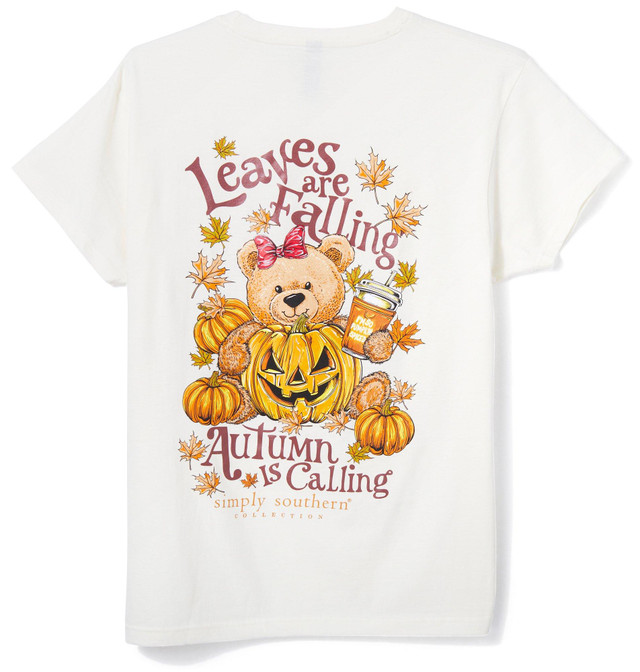 Celebrate the season with the Juniors Fall Leaves Teddy Short Sleeve Crew Neck T-Shirt. Featuring a screenprint of a teddy bear sitting around a jack o'lantern with the text Leaves are falling Autumn is calling on the back and a branded logo with a pumpkin on the front chest, it offers cozy charm for autumn days. Ideal for casual outings or layering in cool weather. Fabrication is 100% cotton.