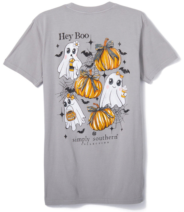 Add playful spirit to fall wardrobes with the Juniors Halloween Hey Boo T-Shirt. Featuring a back graphic of adorable ghosts with eyelashes and bows alongside pumpkins and the text Hey Boo, with a coordinating ghost and brand detail on the front chest, it brings festive charm to seasonal dressing. Ideal for casual wear during spooky season. Fabrication is 100% cotton.