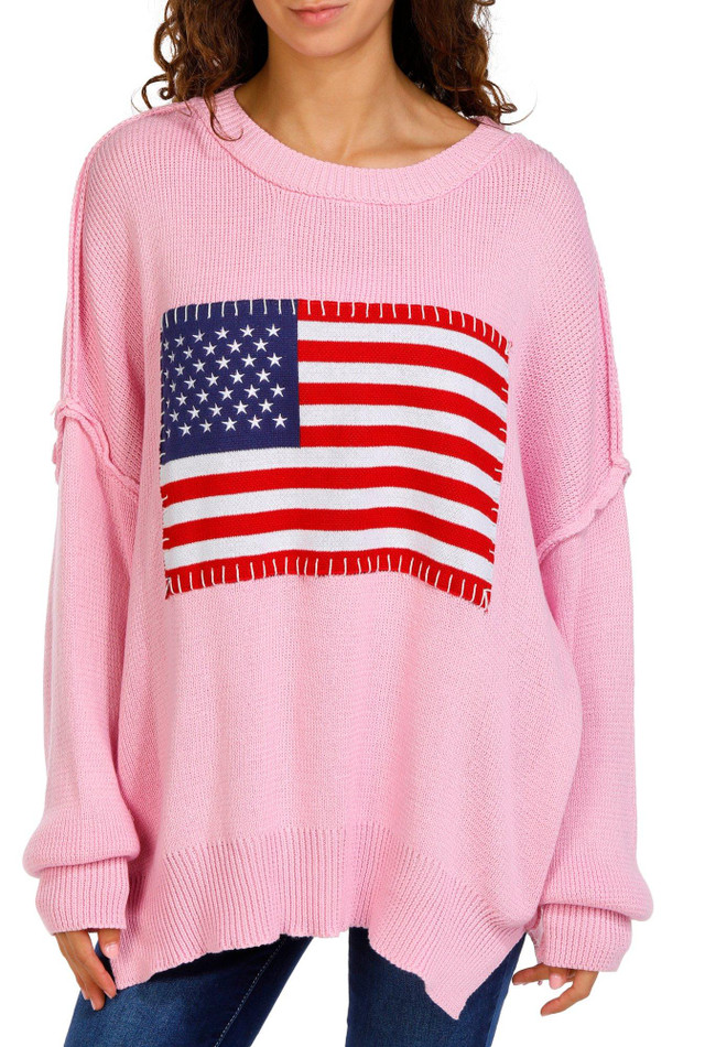 This knit long sleeve sweater features a bold USA Flag patch for a patriotic touch. Soft and comfortable, its a standout piece for cooler days and casual layering.