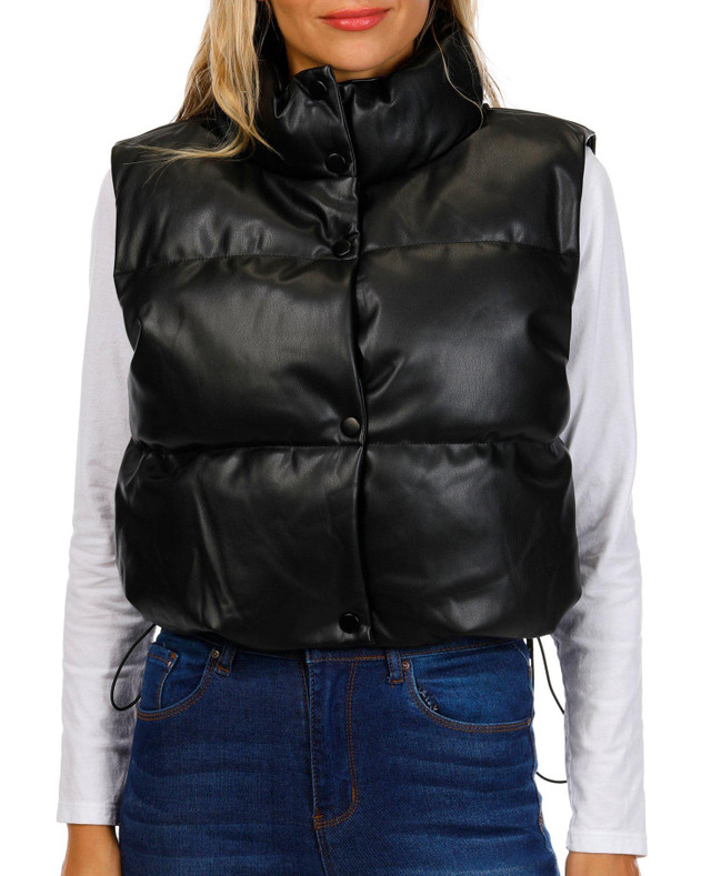 Look trendy this winter season in the Juniors Leather Puffer Vest featuring a button down front and drawcord hem. Fabrication 65% polyurethane, 35% polyester