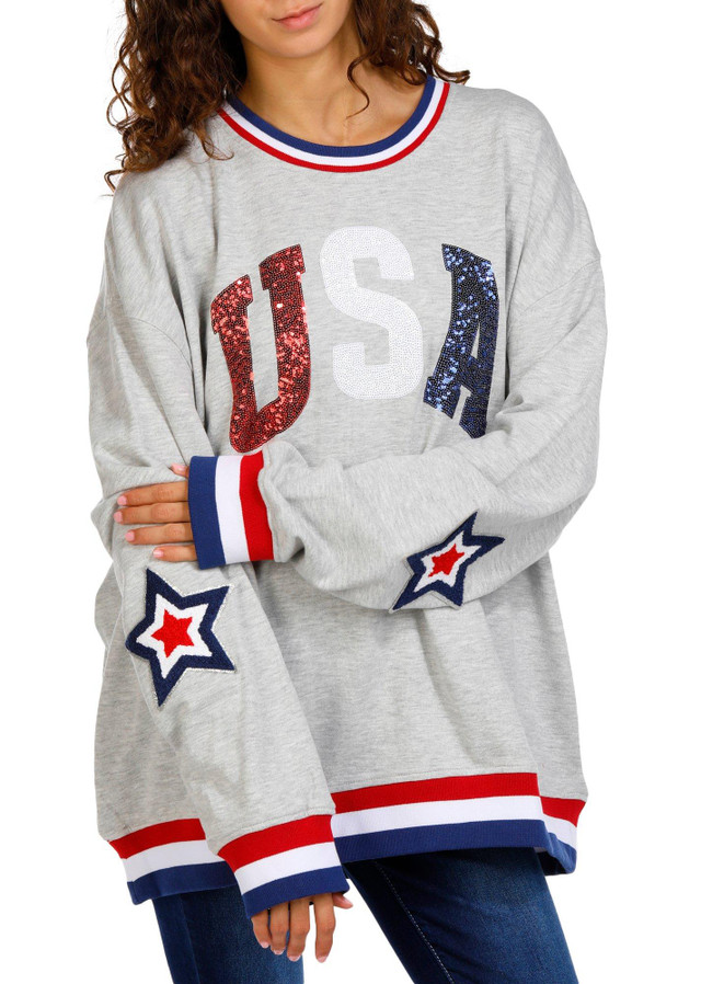 This long sleeve sweater features USA themed patches that add a bold, patriotic touch. Soft and cozy, it's perfect for showing spirit while staying warm and stylish.