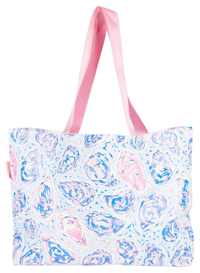 This Oyster Print Reversible Tote is great for any beach or pool day to keep your things dry. Featuring waterproof interior, exterior, reversible design, top carry handles, and an interior zip pocket. Made of 100% Tyvek. Measures 21 in x 11 in.