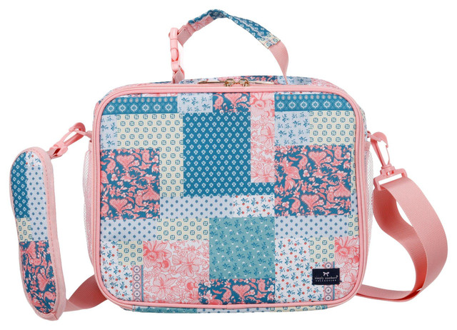 Add functional style to your routine with the Pink Patchwork Lunch Cooler Bag featuring insulated walls to help maintain food temperature. Includes mesh side pockets, a hand strap, and an adjustable removable shoulder strap for versatile carrying. Ideal for school days, office lunches, or weekend outings. Measures approximately 12 in x 10 in x 4 in.