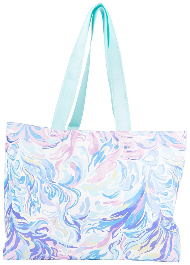 This Watercolor Print Reversible Tote is great for any beach or pool day to keep your things dry. Featuring waterproof interior, exterior, reversible design, top carry handles, and an interior zip pocket. Made of 100% Tyvek. Measures 21 in x 11 in.