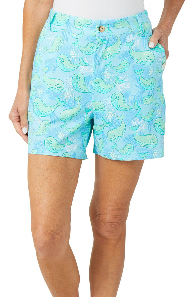 Adventure meets style in these Women's Outdoor Whale Print Shorts. Featuring a playful whale print, 4.5 inch inseam, button-fly zip closure, and both side seam and back pockets, they are designed for comfort and function with UPF 50+ protection. Perfect for sunny days outdoors. Fabrication 85% polyester, 15% spandex
