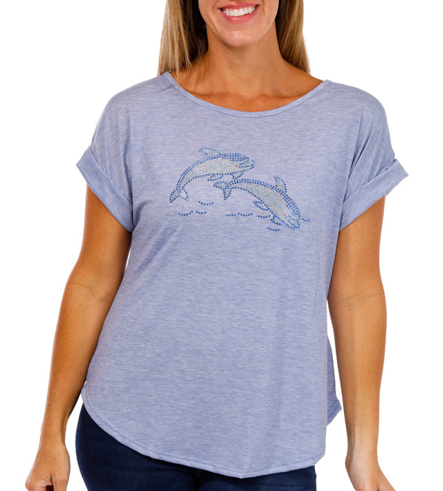 Bring playful energy to your look with this crew neck shirt featuring a trio of embellished dolphins and rolled short sleeves. The soft stretch blend keeps it comfortable while the standout design adds charm. Fabrication: 87% Polyester 10% Rayon 3% Spandex This shirt is 22 inches long.
