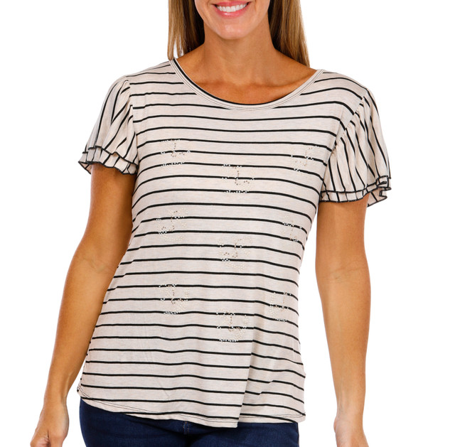Stay sharp in this crew neck shirt with bold stripes and pearl anchor embellishments that add nautical charm. Fluttered sleeves bring shape while the soft stretch blend keeps it easy and comfortable. Fabrication: 87% Polyester 10% Rayon 3% Spandex This shirt is approximately 23 inches long.