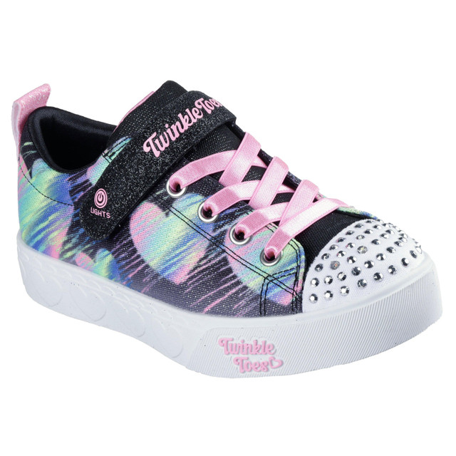 Light up every room with artful style wearing the Twinkle Toes®: Heart Steps - Heart Sketch. This heart-trimmed design features a shimmer fabric upper with 'heart sketch' print, stretch laces, adjustable instep strap, and a light-up rhinestone-embellished toe cap.