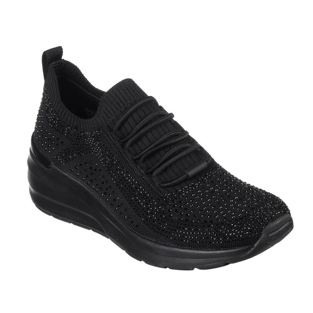 Elevate your look in easy-wearing style this season with Skechers Street Billion - Rhinestone Rambler. This glitzy fashion sneaker features a Stretch Fit engineered knit and synthetic upper with rhinestone embellishments, a stretch-laced front, and a Skechers Air-Cooled Memory Foam insole - all on a wedge-fit midsole, wedge fit with 2-inch height.