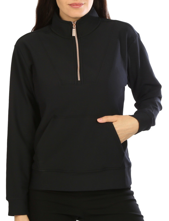 This stylish long sleeve features a solid color design on lightweight ribbed knit fabric, a quarter-zip placket with a mock neckline, kangaroo style front pocket, and classic styling. The top length measures approximately 24 in. Fabrication 80% polyester, 20% elastane.