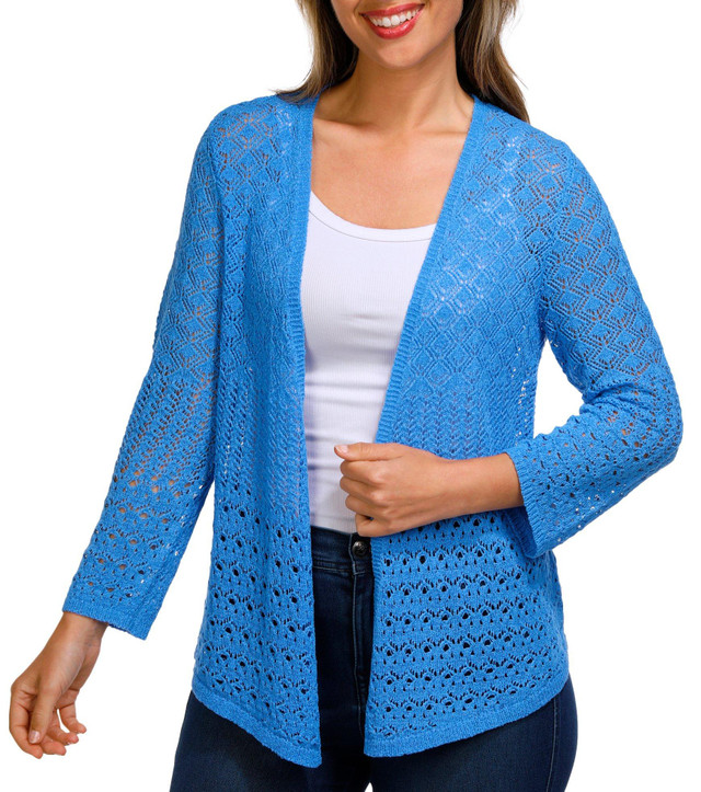 Shine bright with this Womens 3/4 Sleeve Pointelle Knit Cardigan. This stylish cardigan is a perfect blend of comfort and style! Crafted from a soft fabric blend, this cardigan offers a soft, stretchy feel that drapes beautifully. Its open front design and knitted texture make it a versatile layering piece for any outfit, whether you're dressing up for a night out or keeping it casual. Fabrication made from 55% Acrylic, 45% Nylon. Top Length is 22 in.