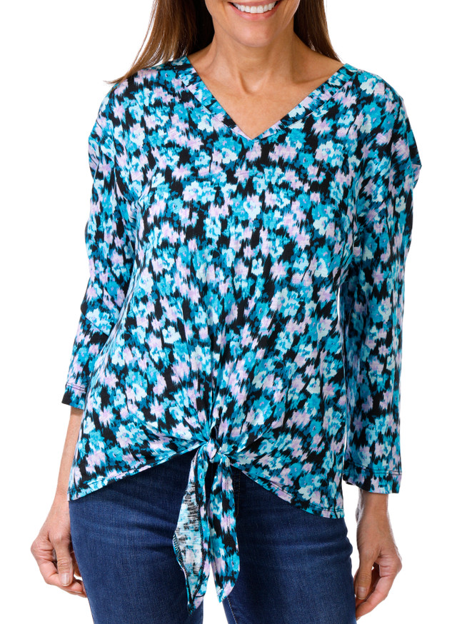 This womens 3/4 sleeve top features a floral pattern with a crew neck and a stylish tie front for a flattering fit. Made from a soft cotton blend, it offers comfortable breathable wear and pairs easily with jeans or casual bottoms for a polished everyday look. Fabrication is 60% cotton and 40% rayon. Top measures approximately 23 in.