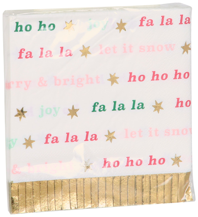 This 20-pack of Christmas cocktail napkins features festive holiday text with shimmering foil fringe, bringing a fun and spirited touch to any seasonal celebration. Napkins measure 5 in x 5 in.
