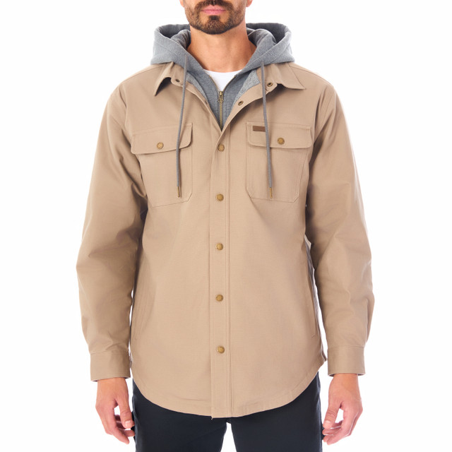 Smiths Workwears classic hooded shirt-jac renewed in our durable Smiths-Stretch cotton/spandex canvas will surely be a crowd pleaser. This jacket will keep you warm in the fall/winter while looking great. It features a zip-front fleece inset and hood under the snap closure, lined in our signature Smiths butter-sherpa, diamond quilted taffeta sleeve lining for easy on and off. Plenty of convenient storage as well with featured 5 pockets including an inside security cellphone pocket.