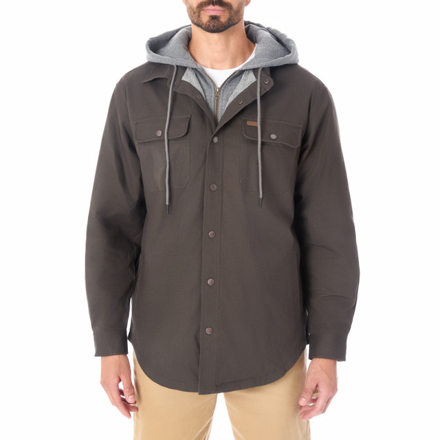 Smiths Workwears classic hooded shirt-jac renewed in our durable Smiths-Stretch cotton/spandex canvas will surely be a crowd pleaser. This jacket will keep you warm in the fall/winter while looking great. It features a zip-front fleece inset and hood under the snap closure, lined in our signature Smiths butter-sherpa, diamond quilted taffeta sleeve lining for easy on and off. Plenty of convenient storage as well with featured 5 pockets including an inside security cellphone pocket.