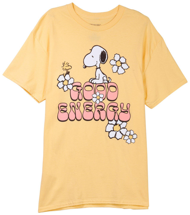 Spread positive vibes with this Juniors Good Energy Snoopy Graphic Tee. Featuring a cheerful Snoopy graphic and Good Energy script, plus a classic crew neckline and short sleeves, it is perfect for laid-back, feel-good style. Fabrication 100% cotton