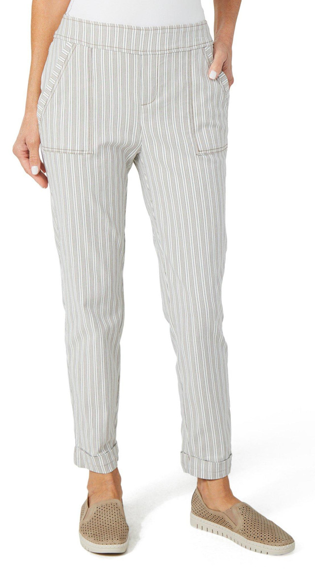 Step into sleek comfort with these Women's Pull-On Stripe Ankle Pants. Featuring a 27 inch inseam and front slash pockets, their streamlined silhouette and subtle stripe design make them perfect for both office wear and casual outings. Fabrication 77% rayon, 20% polyester, 3% spandex