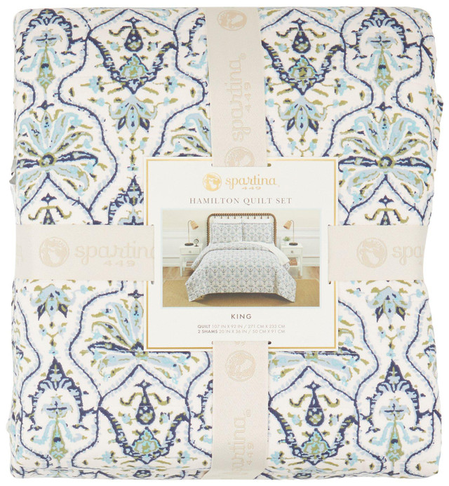 Elevate your bedroom with the timeless elegance of the Hamilton Quilt Set. Featuring a blue and green damask pattern on a soft cream background, this lightweight, 100% cotton quilt is reversible with a delicate botanical print on the back. Complete with coordinating pillow shams framed in a striped fringe, it offers breathable comfort and year-round style.