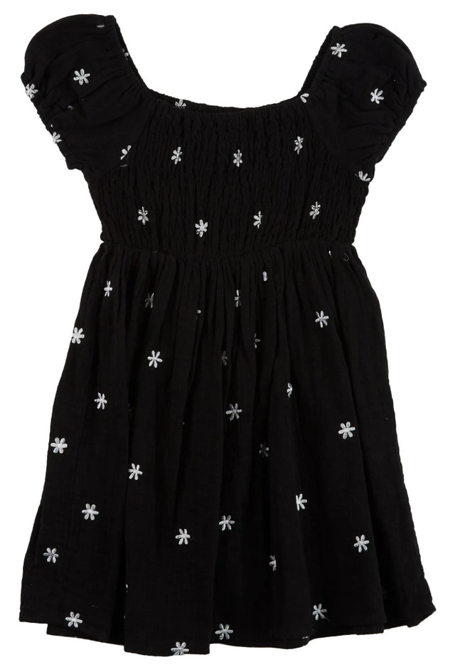 YA charming and stylish pick for any occasion, this dress features a smocked bodice, square neckline, and flared skirt. The delicate white floral embroidery adds a touch of elegance to the classic black design, making it perfect for both casual and dressy moments.