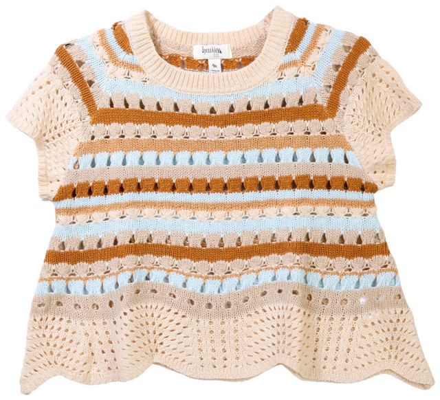The Big Girls Short Sleeve Striped Sweater Top brings charm with its soft knit body and colorful striped design. It features a classic crew neckline, short sleeves for warm weather comfort, and a scalloped hem that adds a sweet finishing touch. Fabrication 100% acrylic