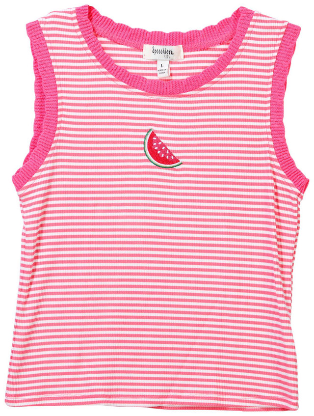 The Girls Pink Stripe Watermelon Tank Top is a sweet and comfy choice made from a soft blend of polyester, rayon, and spandex. It features a playful striped print, an embroidered watermelon detail, and delicate knit scalloped trim on the neckline and sleeves for a charming finish.