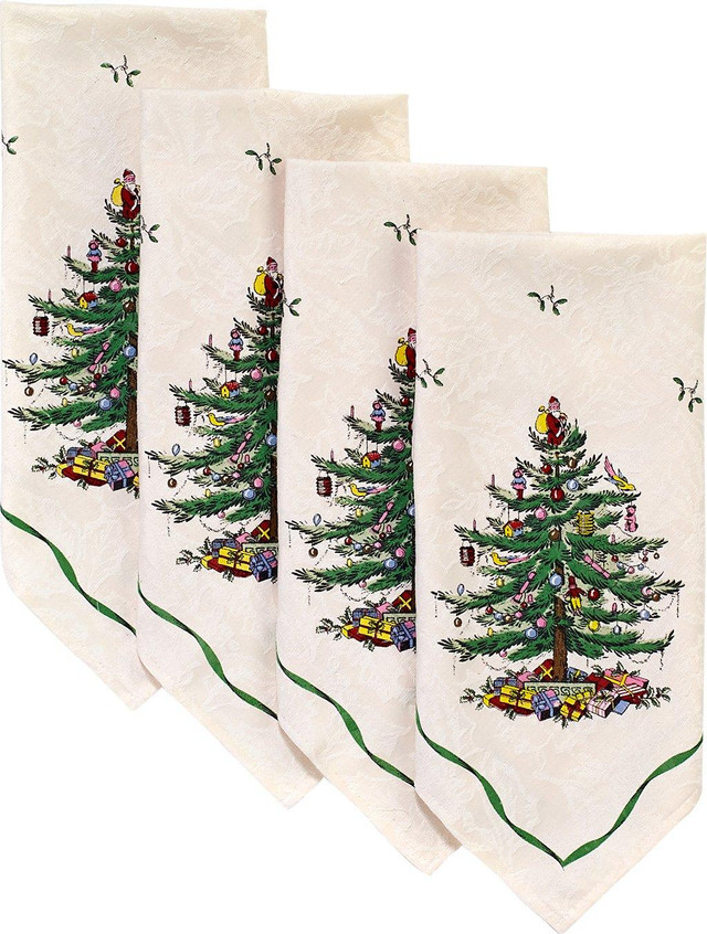 The new Spode Christmas Tree Set of 4 Napkins by Avanti features the iconic Christmas tree design with tossed holly leaves and a green ribbon border. Printed on a 58% cotton/42% polyester jacquard woven cloth. Measures 20 x 20 inches.