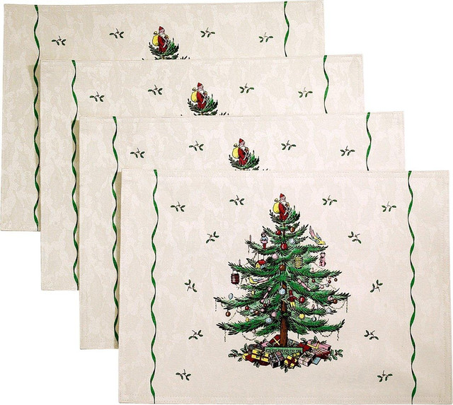 The new Spode Christmas Tree Set of 4 Placemats by Avanti features the iconic Christmas tree design with tossed holly leaves and a green ribbon border on either side. Printed on a 58% cotton/42% polyester jacquard woven cloth. Measures 19 x 13 inches each.