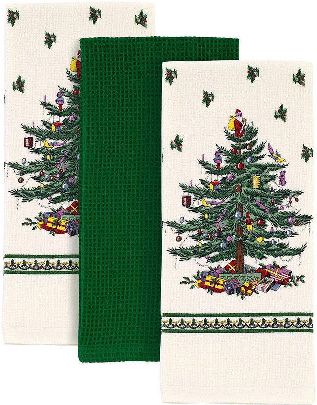 Featuring the iconic printed Christmas Tree with tossed holly leaves and ribbon border on a 100% cotton velour towel, the Spode Christmas Tree Kitchen Towel adds both form and function to your holiday kitchen. Measures 16 x 28 inches (3pcs included).