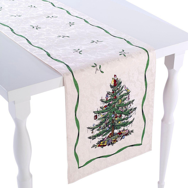 The Spode Christmas Tree Runners by Avanti features the iconic Christmas tree design with tossed holly leaves and a green ribbon border. Printed on a 58% cotton/42% polyester jacquard woven cloth. Available in 3 sizes: 14x72, 14x90, 14x108