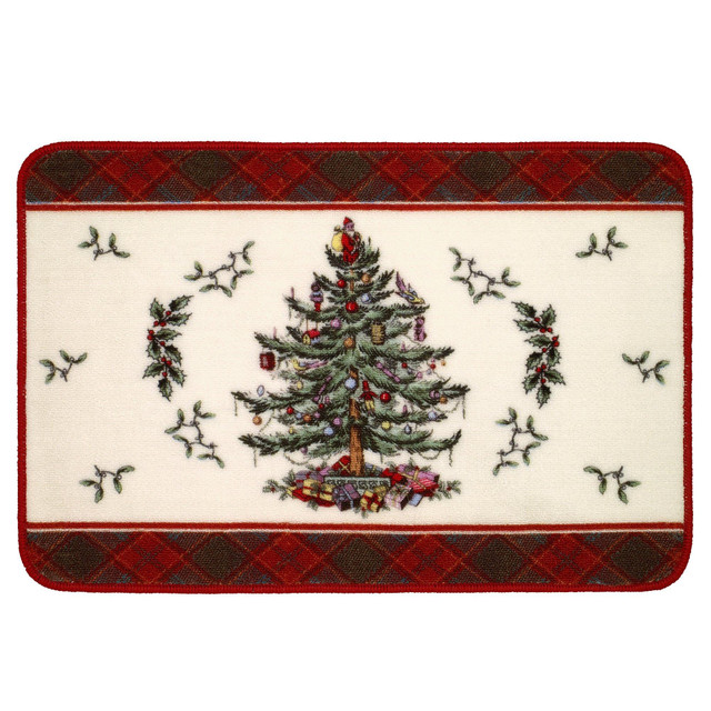 The Spode Christmas Tree® Tartan Bath Rug by Avanti features the iconic Christmas Tree surrounded by tossed holly leaves. The red and green plaid borders the top and bottom. Printed on 100% nylon, 20 x 30, non-skid latex back. Dimension - L = 30 x W = 20 x H= 0.50