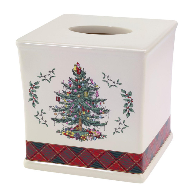 The Spode Christmas Tree® Tartan Tissue Box Cover by Avanti brings a new twist to an old classic. The iconic Spode Christmas Tree, since 1938,is now paired with a green and red tartan plaid border on an ivory body for a fresh look. Made of durable resin, measures 5.75L x 5.75W x 5.88H. Dimension - L = 5.75 x W = 5.75 x H= 5.88
