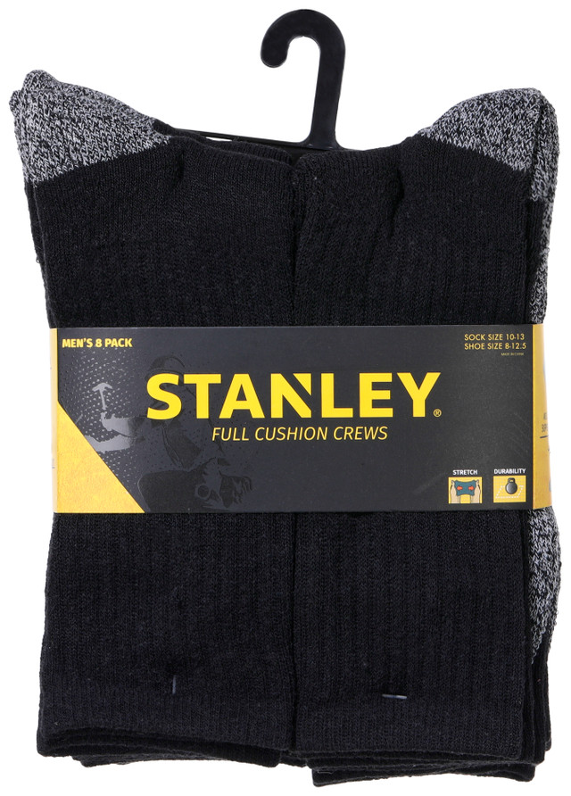 Built for durability and all-day comfort, these Mens Full Cushion Crew Socks are ideal for work or outdoor wear. Made with a blend of 66% polyester, 30% recycled cotton, 2% spandex, and 2% rayon, they offer a thick, cushioned feel with reinforced heels and toes. Sock size 10-13 fits shoe size 6-12. Pack includes 8 pairs.