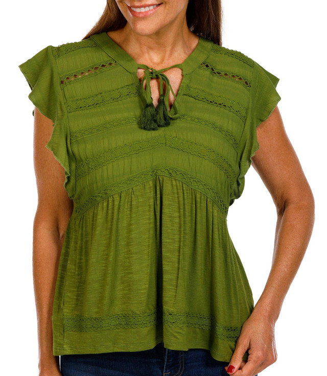 Elevate everyday looks with a solid color petite knit top, featuring flutter sleeves and delicate lace embellishments for added charm. A flattering V-neckline with tassel tie adds a boho touch, while the soft knit fabric ensures all-day comfort and effortless style. Fabrication is 95% rayon, 5% spandex.