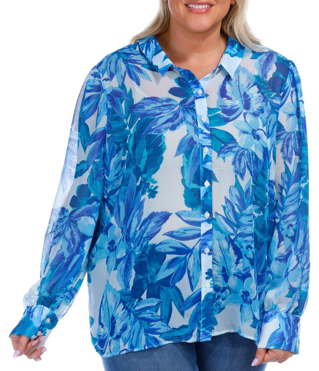 This plus long sleeve button down blouse combines elegance and sophistication with its refined detailing. Crafted from lightweight, breathable fabric, it offers a flattering silhouette and versatile style. Perfect for both professional and casual settings, this blouse elevates any wardrobe with timeless charm. Fabrication is 100% Polyester. The top length measures approximately 30 in.