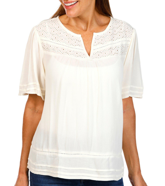 Breeze through your day in this airy slit neck top made for petites! Lightweight and comfy, it features a flirty neckline and delicate cotton lace accents for a touch of charm. Dress it up or keep it casualeither way, youll love the effortless style and pretty details that make this top a warm-weather favorite.