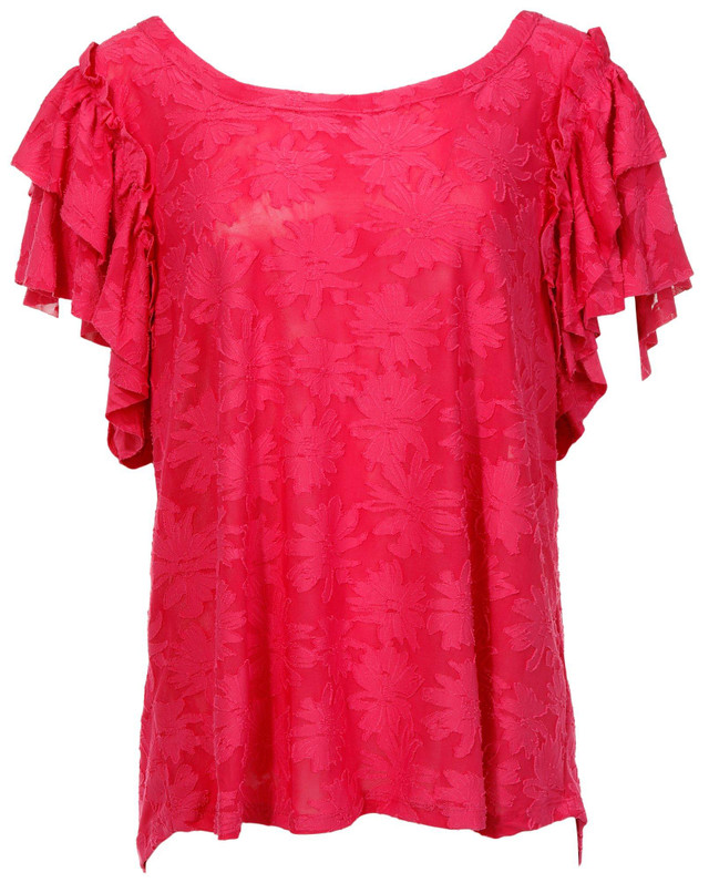 This feminine top features a round neckline and short ruffle sleeves, adding a soft, romantic touch. The floral pattern is enhanced with a 3D or textured design, giving the fabric depth and visual interest. Perfect for elevating everyday looks with a hint of elegance and charm.