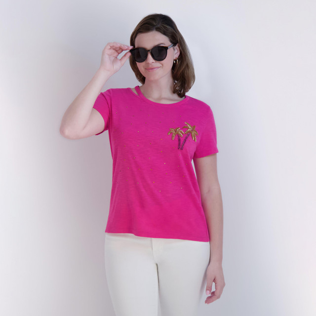 Make the Stella Parker Short Sleeve Cut Out Top the stylish and confident choice for any occasion. It features a sparkling palm tree design with chic cut-out details, adding a touch of glamour to your wardrobe. Perfect for wearing to work or enjoying lunch with friends, it effortlessly combines elegance and comfort. Elevate your fashion game with this versatile piece that promises to make you shine. Model is 5 ft. 8.in. and wearing size small. Fabrication 95% cotton, 5% spandex.