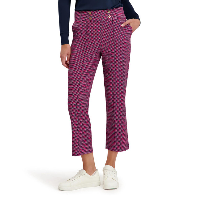 The Flora Pull-On Crop Pant blends tailored style with everyday comfort. Made from lightweight stretch fabric, it offers flexible movement and UPF 50 sun protection. Gold button accents add polish to the clean silhouette, while functional pockets provide practical appeal. Ideal for versatile, modern dressing. Inseam measures 26 in. Fabrication 92%polyester, 8% spandex.