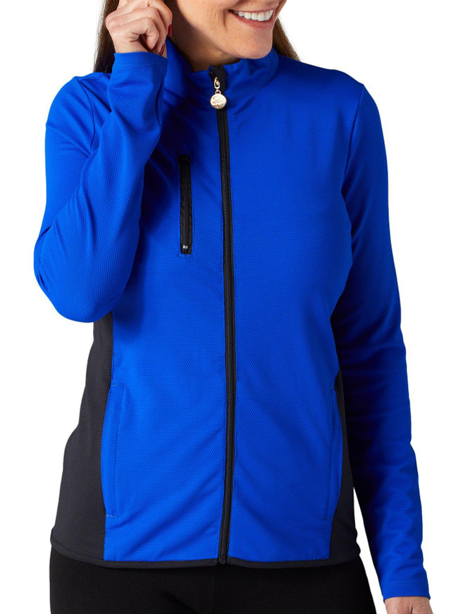 Stay protected and stylish on the golf course with this stylish Long Sleeve Jacket. Designed with sun protection in mind, this jacket ensures you stay safe under the sun. The full zip front allows for easy on and off, while the double zipped side pockets provide secure storage for your essentials. Perfect for varying weather conditions, this jacket combines functionality and comfort, making it a must-have for any golfer's wardrobe. Fabrication is 96% polyester, 4% spandex.