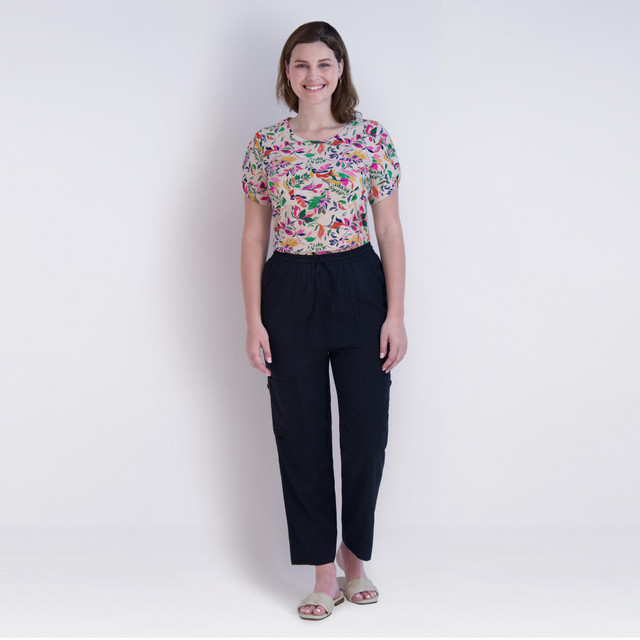 Elevate your everyday look with the Stella Parker Pull-On Overlap Capri. It features a stylish solid color design with front pockets and pull-on styling. Ideal for work, lunch dates, or weekend outings, it effortlessly combines comfort and trendiness. Model is 5 ft. 8.in. and wearing size small. Inseam measures 28 in. Fabrication 100% rayon challis.