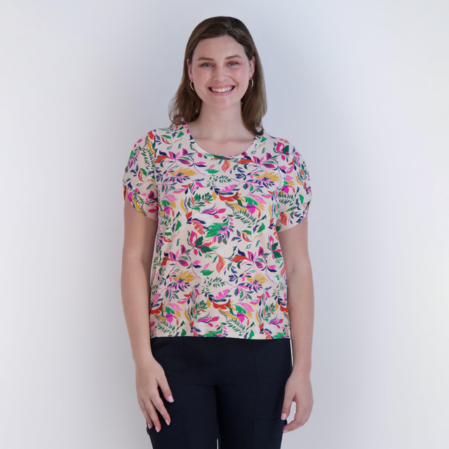 Elevate your everyday look with the Stella Parker Tulip Short Sleeve Twist Top a perfect blend of colorful fun and stylish fashion! This short-sleeve top features unique tulip sleeves with chic twist detail, making it a versatile addition to your wardrobe. Ideal for work, lunch dates, or weekend outings, it effortlessly combines comfort and trendiness. Model is 58 and wearing size small. Fabrication 95% cotton, 5% spandex.