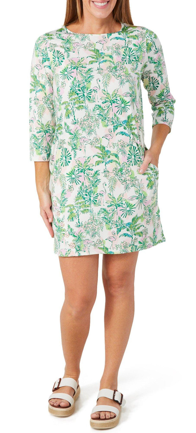 Stay stylish and protected in this 3/4 sleeve dress, featuring a vibrant print pattern and thoughtful button hem details for a touch of charm. Crafted with built in sun protection, its perfect for sunny strolls, outdoor brunches, or vacation days. Fabrication is 87% polyester, 13% spandex.