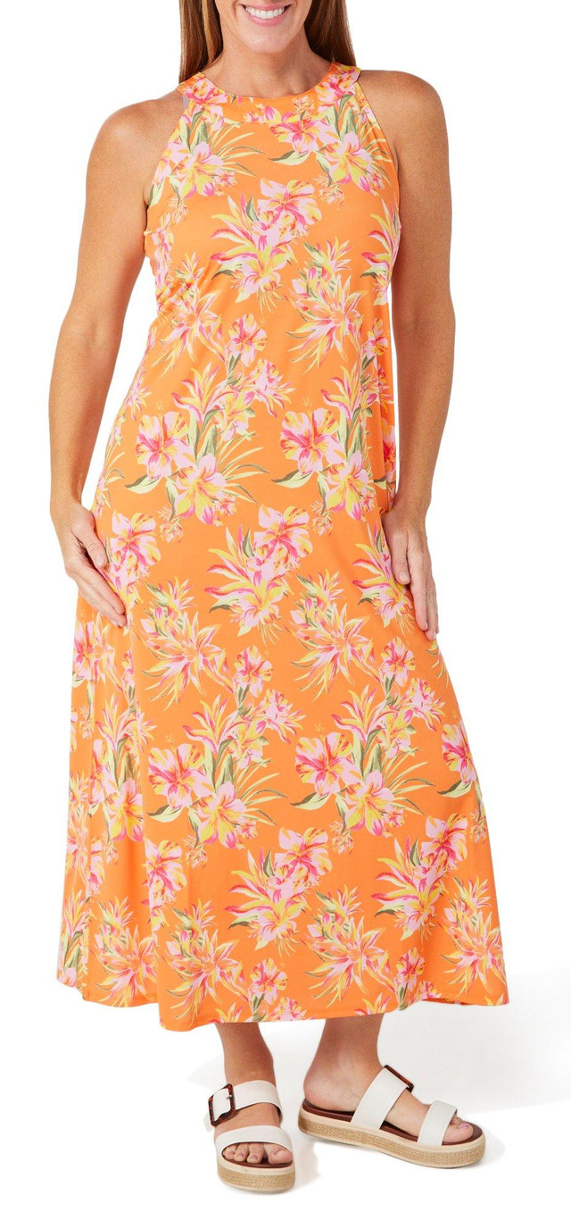 Make a statement in effortless style with this sleeveless maxi dress, featuring a bold print pattern and a flattering halter neckline. Flowing with grace and ease, its lightweight design moves beautifully with every step, perfect for sunny days, beach strolls, or evening getaways. Fabrication is 92% polyester, 8% spandex.