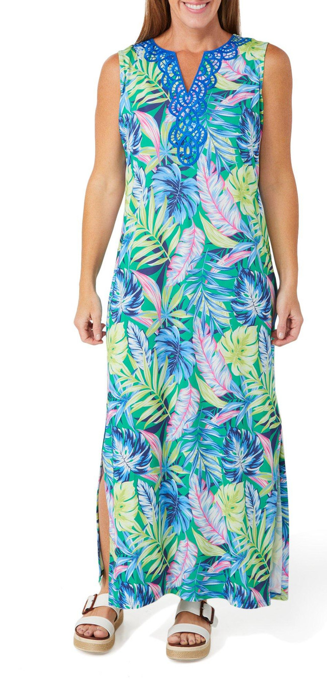 Bask in breezy elegance with this sleeveless maxi dress, featuring a vibrant print pattern and a beautifully detailed crochet yoke with a notch neckline. Designed with built in sun protection, its perfect for warm, sunny days when style and comfort are a must. Fabrication is 92% polyester, 8% spandex.